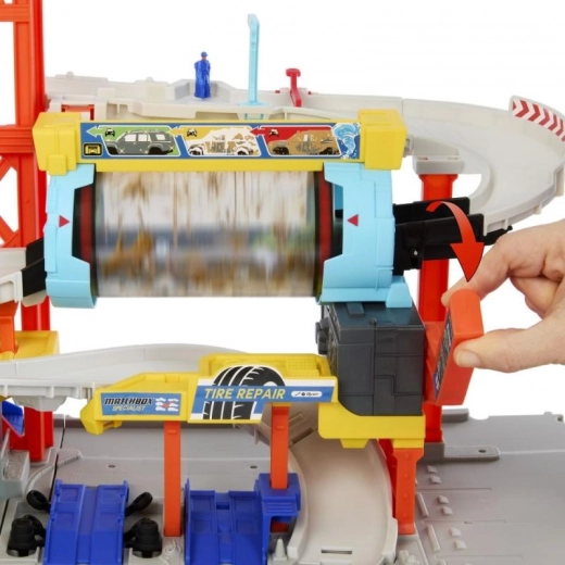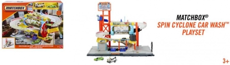 Das Matchbox Turbo Zyklon Spielset verwandelt das Kinderzimmer in eine belebte Autowaschanlage mit Service. Die Autos fahren die Spiralrampe ins obere Stockwerk, wo ein „Parker“ sie in den drehenden Waschtunnel leitet. Ziehe am Hebel und die transparente Trommel rotiert – sie stoppt zufällig im Modus „schmutzig“, „eingeseift“ oder „sauber“. Ist das Fahrzeug „sauber“, rollt es automatisch die Rampe hinunter und macht Platz für das nächste.