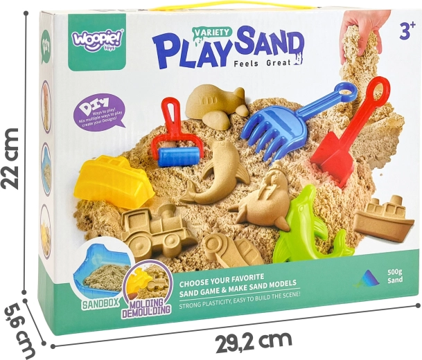 Mit diesem WOOPIE-Set aus kinetischem Sand können Kinder spielerisch Formen gestalten – von Tieren bis zu Fahrzeugen. Der Sand ist selbsthaftend, formstabil, trocknet nicht aus und eignet sich ideal für sensorisches Spiel auf dem Tisch zu Hause. Die leichten Werkzeuge sind auch für kleine Kinderhände gut zu handhaben.