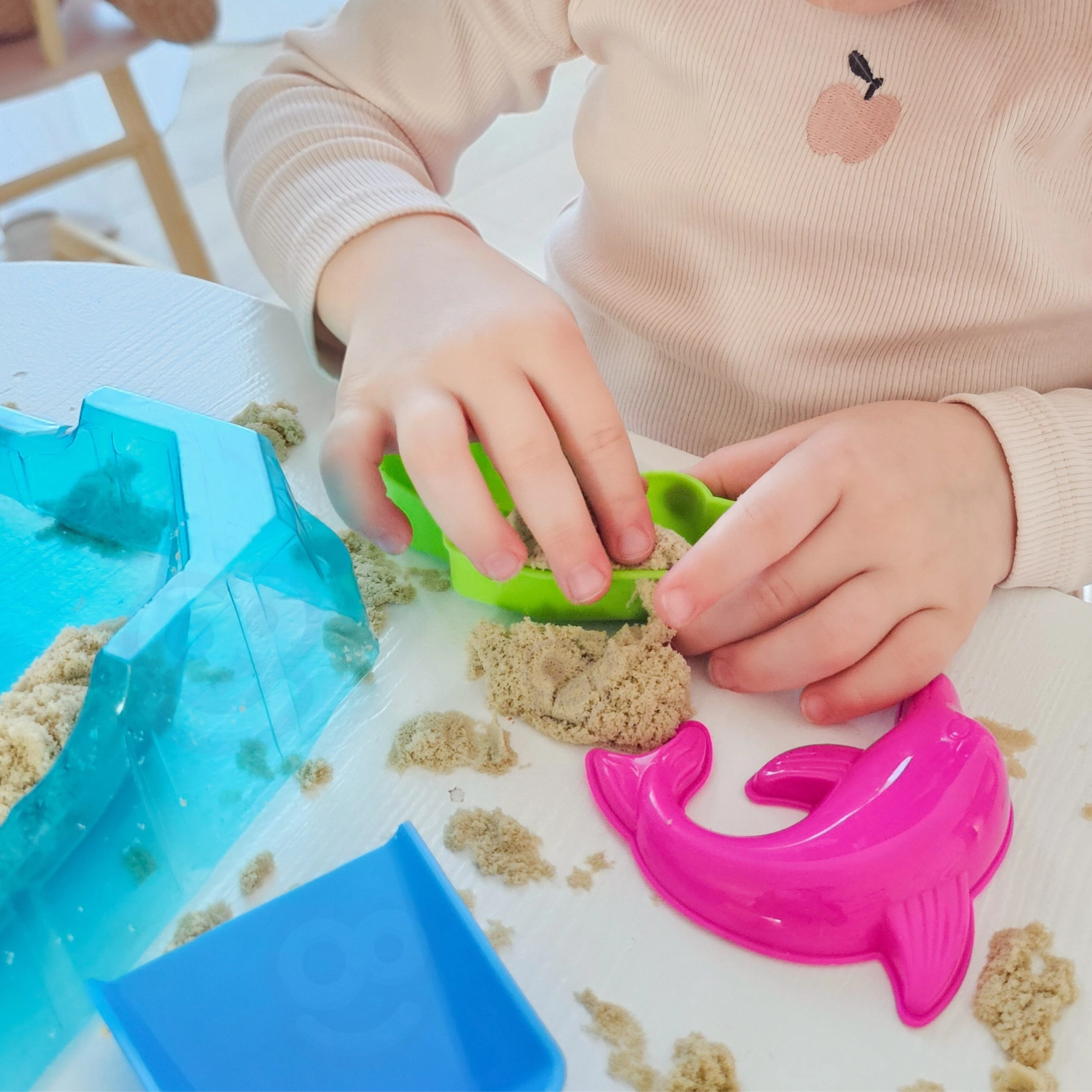 Das tragbare blaue Tablett dient als Mini-Sandkasten. Es hält Sand und Werkzeuge beisammen, sodass sich Kinder ohne Unordnung ganz auf das kreative Spiel konzentrieren können.