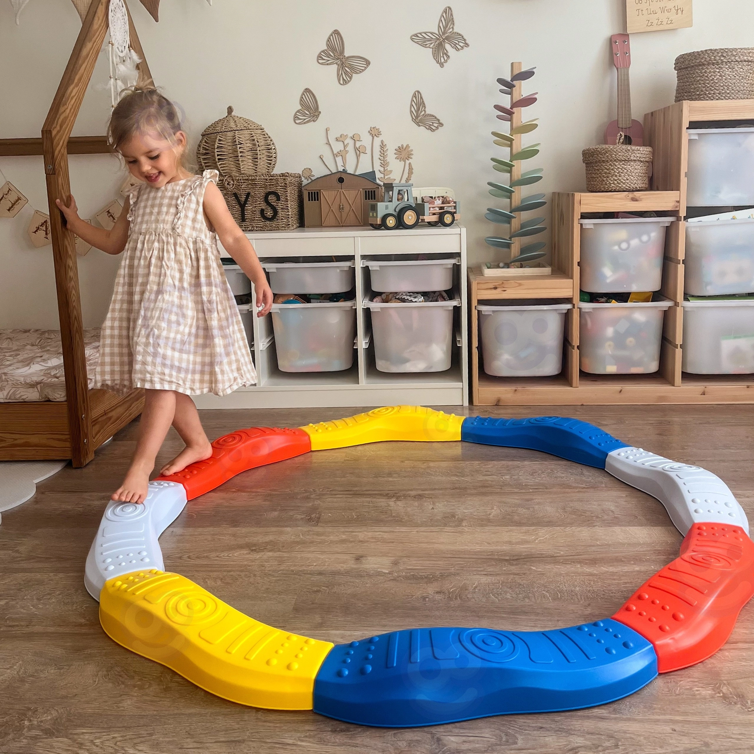 Gestalten Sie einen Kreis mit einem Durchmesser von ca. 130 cm, einen geschwungenen „Schlangen“-Pfad oder kleinere Runden. Die Strecke eignet sich für Kinderzimmer, Spielräume und den Garten – Voraussetzung ist eine ebene Fläche. Ideal zur Förderung der Grobmotorik, Propriozeption und für ein spielerisches Gleichgewichtstraining barfuß oder mit Socken.