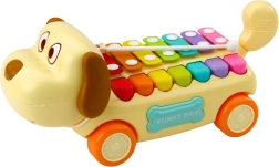 Der rollende Hund ist mit einer vollständigen Reihe bunter Zimbeln ausgestattet, die mit dem mitgelieferten Schlägel zum Klingen gebracht werden können. Dank der Befestigung des Schlägels an der Schnur des Spielzeugs geht dieser auch bei intensivem Spielen nicht verloren. Der Hund ist aus langlebigen und sicheren Materialien gefertigt, seine Konstruktion unterstützt die Entwicklung von Hand-Auge-Koordination, Feinmotorik und Musikalität. Ideal als pädagogisches Spielzeug für Kinder ab 18 Monaten.