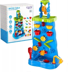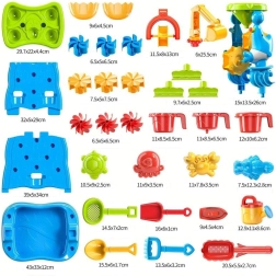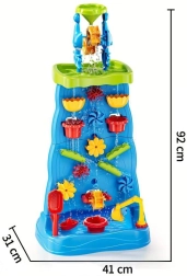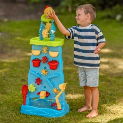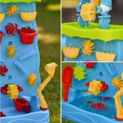 Die Montage ist schnell und werkzeuglos. Enthalten ist umfangreiches Zubehör: Schaufeln, Harke, Siebe, Gießkanne, Eimer, Förmchen und Wasserbecher. Das Spielzeug unterstützt die Sinneswahrnehmung, das logische Denken und das Problemlösen – alles in Form spielerischer Experimente.