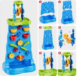 Die breite Basis und die von beiden Seiten zugängliche Wand ermöglichen gemeinsames Spiel. Kinder können gleichzeitig Wasser eingießen, Kaskaden verfolgen und sich drehende Räder beobachten – ideal zum Teilen und für Zusammenarbeit.