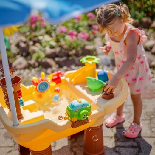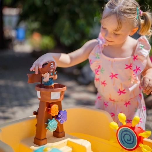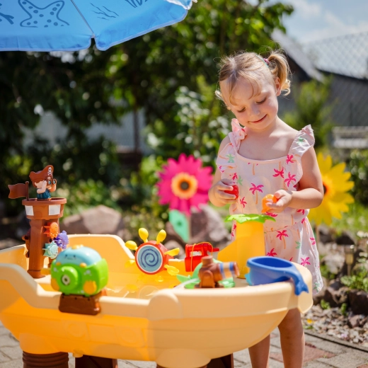 Der große Woopie Wasser-Spieltisch im Design eines Piratenschiffs verwandelt den Garten in eine Bucht voller Entdeckungen. Kinder können Wasser eingießen, Wasserräder in Gang setzen, mit der Kanone spritzen, Blasen machen und das Schiff mithilfe des Piratenturms und Steuerrads lenken. Der integrierte Sonnenschirm sorgt auch an heißen Tagen für Schatten – für komfortables und sicheres Spielen.