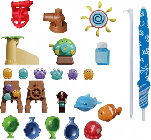 - Wasser-Spieltisch, Wasserkanone, Seifenblasenmaschine, Wasserrutsche, Anker, Mast mit Aussichtsplattform, Piratenfigur, 6 kleine Wasserräder, 1 großes Wasserrad, 3 schwimmende Tierchen, 4 Becher zum Umfüllen, Sonnenschirm