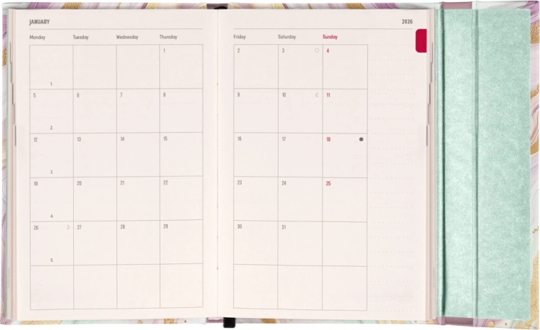 Der Planer beinhaltet auch monatliche Übersichten, geeignet für die Planung von Ferien oder längeren Urlauben. Sein magnetischer Verschluss sorgt für ein sicheres Verschließen und den Schutz Ihrer Pläne.