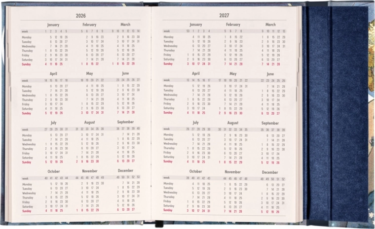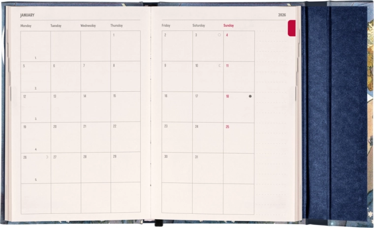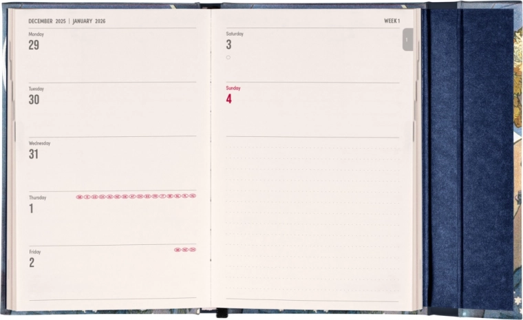 Eleganter wöchentlicher Kalender im Format 11 x 16 cm mit Motiv von Alfons Mucha ist perfekt für alle, die im Jahr 2026 ihre Pläne klar im Griff haben möchten.
