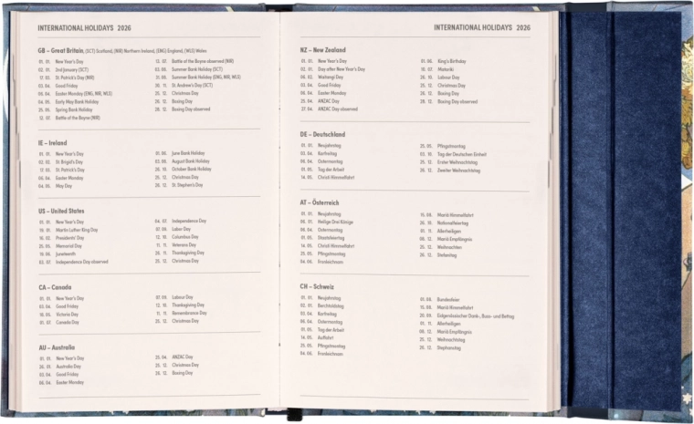 Der Kalender enthält auch monatliche Übersichten, die ideal für die Planung von Feiertagen und Urlauben sind, und umfasst internationale Feiertage.