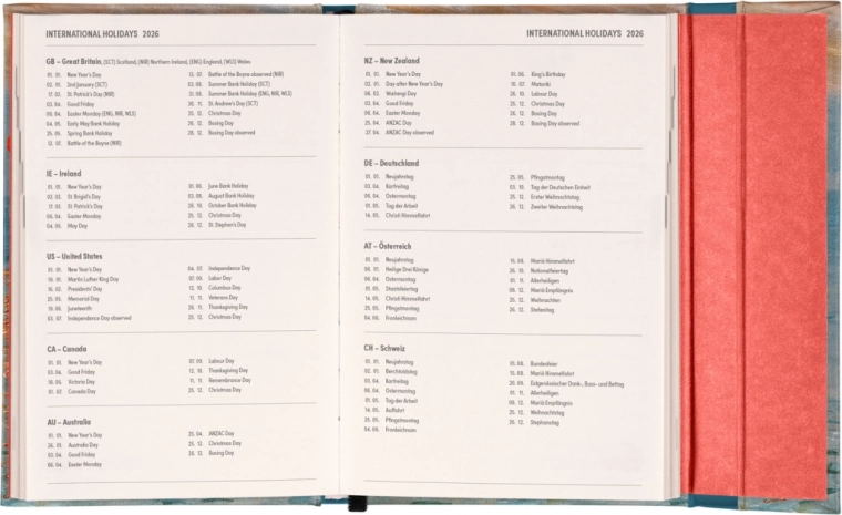 Der Kalender ist in englischer Sprache und enthält auch einen Überblick über internationale Feiertage, was die Planung auf globaler Ebene erleichtert. Dank des praktischen magnetischen Verschlusses müssen Sie sich keine Sorgen um den Verlust wichtiger Notizen oder das Verbergen wichtiger Informationen machen.