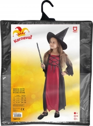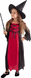 Das Kostüm umfasst ein schwarzes und rotes Kleid mit langem Schnitt und detaillierter Schnürung, die einen authentischen Hexenstil schafft. Perfekt für Halloween oder Karnevalsfeiern.