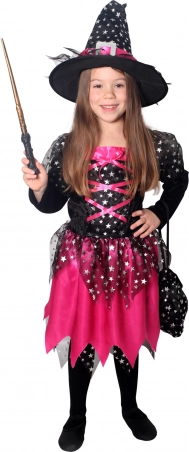 Magisches Kostüm für kleine Hexen! Dieses schwarz-rosa Kostüm ist ideal für Mädchen im Alter von 4 bis 6 Jahren, verziert mit rosa Bändern und silbernen Sternchen.