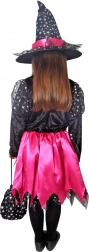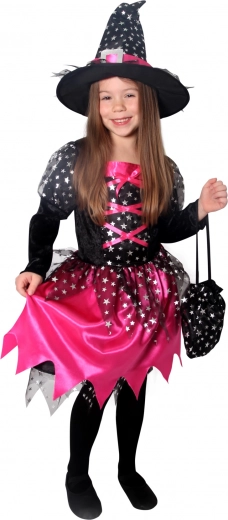 Magisches Karnevalskostüm für kleine Hexen! Das schwarz-pinke Kostüm ist ideal für Mädchen im Alter von 6-8 Jahren, Höhe 117-128 cm. Es zeichnet sich durch pinke Bänder und silberne Sternchen aus.