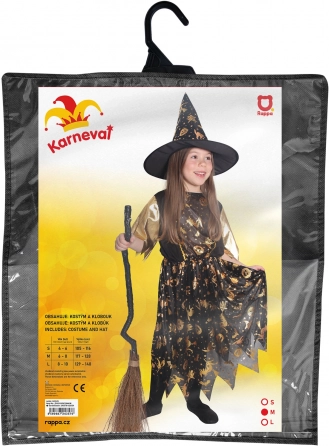 Halloween-Kostüm für kleine Hexen! Das Kostüm in schwarz-goldener Farbe ist ideal für Mädchen im Alter von 6-8 Jahren. Goldene Halloween-Motive machen dieses Kleid unwiderstehlich. Ein perfekt abgestimmter Hexenhut ist im Lieferumfang enthalten.