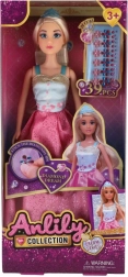 Die 30 cm große Anlily-Puppe bezaubert mit einem eleganten, glitzernden Kleid in Rosatönen und Details in Blau und Gold. Den Stil ergänzen ein Haarreif und realistisch wirkende, lange Haare, die zum Kämmen und Frisurenmachen einladen. Im Set enthalten sind kleine „diamantene“ Verzierungen, die dem Spiel eine luxuriöse Note verleihen.