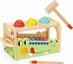 Entdecken Sie die Welt der Klänge und Rhythmen mit diesem unterhaltsamen Spielzeug, das Hammerbank und Xylophon kombiniert. Niedliches Krokodil mit integriertem Xylophon ist ideal zur Förderung der Feinmotorik und des Gehörs. Durch den Schlag mit dem Hammer fallen die Holzkugeln herunter, spielen das Xylophon und erzeugen eine Melodie. Dank der farblich unterscheidbaren Tasten kann das Xylophon auch allein gespielt werden.
