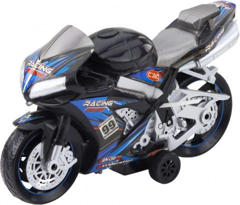 Dieses schwarz-blaue Motorrad ist aus hochwertigem Kunststoff gefertigt, es ist beständig gegen Beschädigungen und hat feste, breite Räder mit stabiler Unterstützung, was sicheres und bequemes Spielen auf verschiedenen Oberflächen gewährleistet. Beleuchtungs- und Soundeffekte können durch Drücken eines Knopfes aktiviert werden - realistische Motorengeräusche und Lichtblitze fesseln die Kinder und verleihen dem Spiel einen realistischen Touch.
