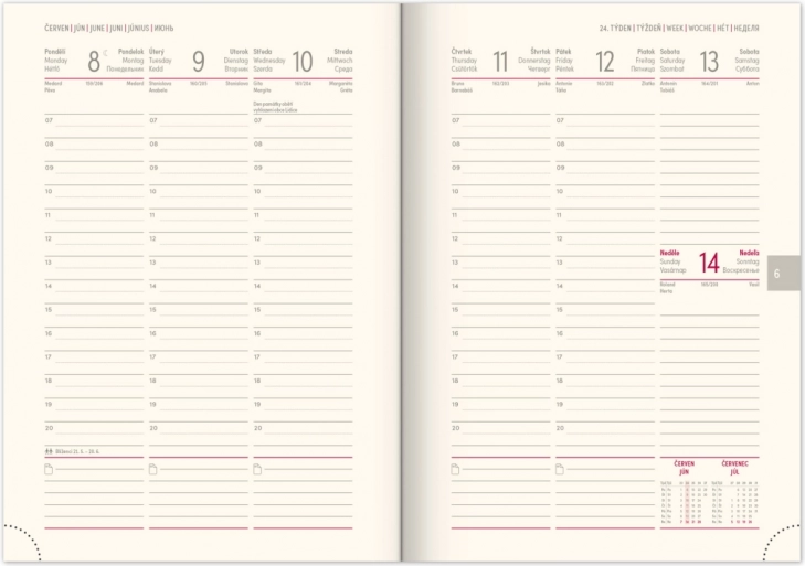 - Wochenkalender tschechisch-slowakischen Formats mit zusätzlichem Englisch, Deutsch, Ungarisch und Russisch.