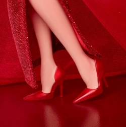 Rubinrote Absatzschuhe vervollständigen ihren atemberaubenden Look, und goldene Ohrringe mit dem „M“-Motiv verweisen auf das traditionelle Mattel-Logo.