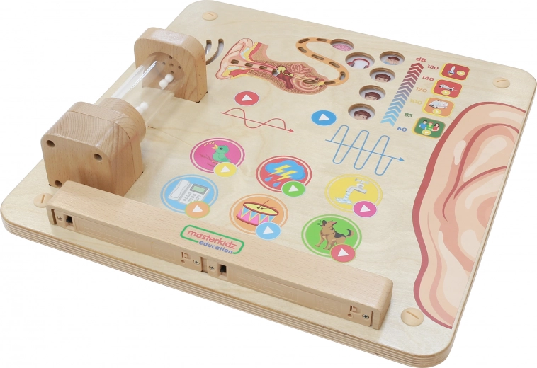Bildungstafel Masterkidz Montessori hilft Kindern, Fähigkeiten durch Spiel zu entwickeln. Schalltafel mit interaktiven Elementen.