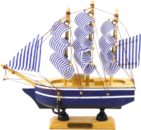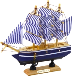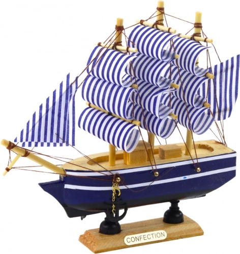 Das stilvolle Segelschiffmodell mit klassischer Konstruktion ist ideal für all diejenigen, die maritime Ästhetik bewundern. Traditionelle dreimastige Takelage in weiß-blauen Streifen und granatfarbenem Rumpf mit weißem Streifen schaffen einen effektvollen Look. Dank der ästhetischen Proportionen und der handgefertigten Verarbeitung besticht das Modell durch feine Details und elegantes Aussehen.