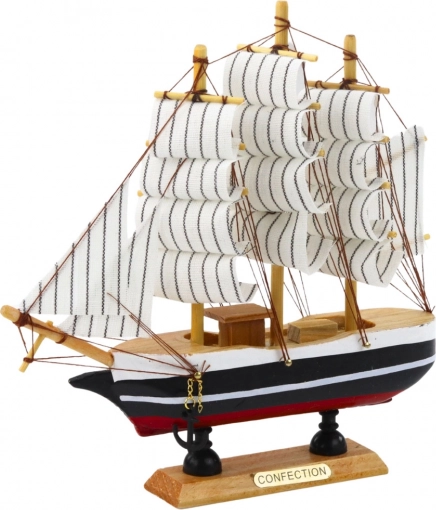 Dieses kompakte dreimastige Modell ist eine elegante Replik eines klassischen Schiffes mit kontrastierendem Design in Schwarz, Weiß und Rot. Seine charakteristischen Segel mit dünnen Streifen und realistische Takelage, zusammen mit der dreimastigen Konstruktion, machen es ideal zum Aufstellen.