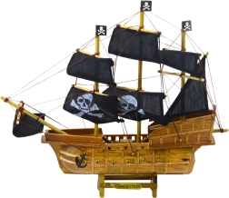 Das Modell eines Dreimasterschoners im Piratenstil wird jeden Liebhaber von Meeresabenteuern begeistern. Entworfen nach legendären Korsarenschiffen des 17. und 18. Jahrhunderts, bietet dieses Modell einen natürlichen hölzernen Rumpf mit seitlichen Kanonennachbildungen und einer markanten Linie von Heck und Bug. Schwarze Stoffsegel mit Schädel- und gekreuzten Knochen-Prints sowie Piratenflaggen verleihen dem Schiff ein unwiderstehliches, charakteristisches Aussehen, das an Seeräuber und die legendäre Freiheit auf offenem Meer erinnert.