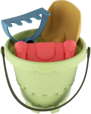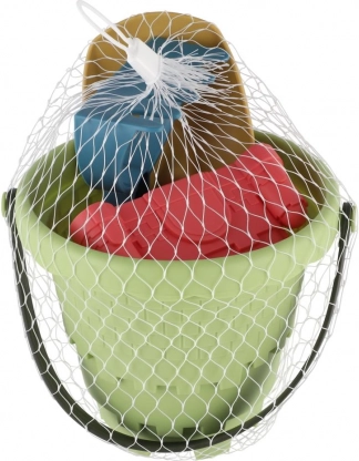 Plastik-Sandspielset mit Eimer, Schaufel, Harke und 3 Förmchen im Netz