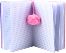Ein funktionales Lesezeichen mit rosa Bommel erleichtert den Zugriff auf ausgewählte Seiten und fügt ein zauberhaftes dekoratives Element hinzu. Innen befinden sich 80 linierte Blätter, ideal für Tagebuch, Schulheft, Organizer oder kreative Notizen.