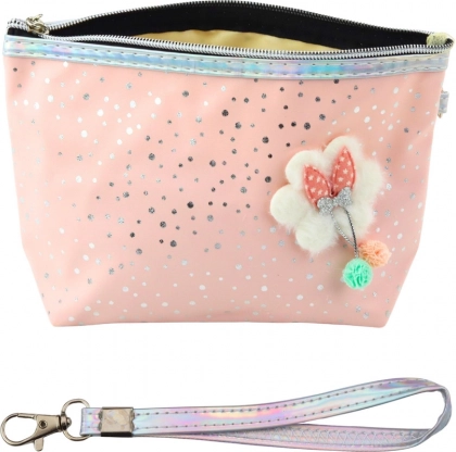 Stilvolles und funktionales Mäppchen oder Kosmetiktasche in zartem Puderrosa mit glitzernder Oberfläche. Ideal für den täglichen Gebrauch, für die Schule oder auf Reisen.