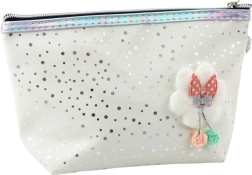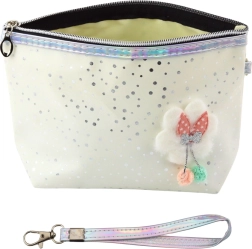 Die Tasche ist mit einem zuverlässigen Reißverschluss und einem bequemen Griff mit Karabiner ausgestattet, was ein einfaches Befestigen am Rucksack oder Tragen am Handgelenk ermöglicht. Verziert mit einer Seidenschleife und einem Pompon, die verspielten Charme verleihen, ist die Oberfläche mit Glitzer dekoriert, der im Licht erstrahlt und ein attraktives und modernes Erscheinungsbild schafft.