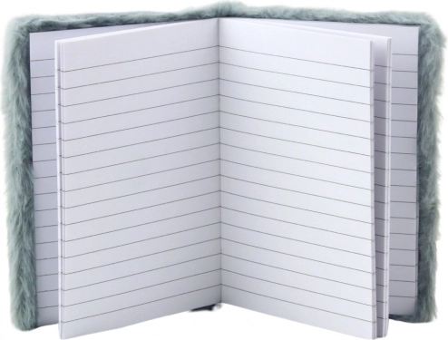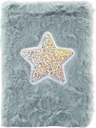 Der weiche Umschlag aus angenehm zu berührendem Plüsch in einem zarten, grauen Farbton verleiht dem Notizblock einen besonderen Charakter. In der Mitte des Umschlags befindet sich ein glitzernder Stern, der die Farbe wechselt und im Kontrast zum weichen Material steht.