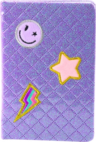 - Farbige Aufnäher in Form von Sternen, lachenden Gesichtern und Blitzen verleihen dem Tagebuch ein modernes Aussehen