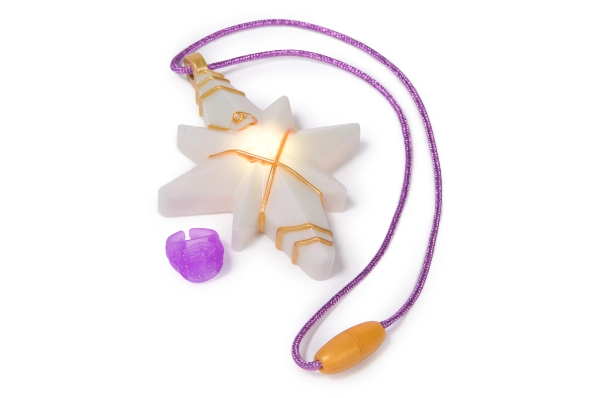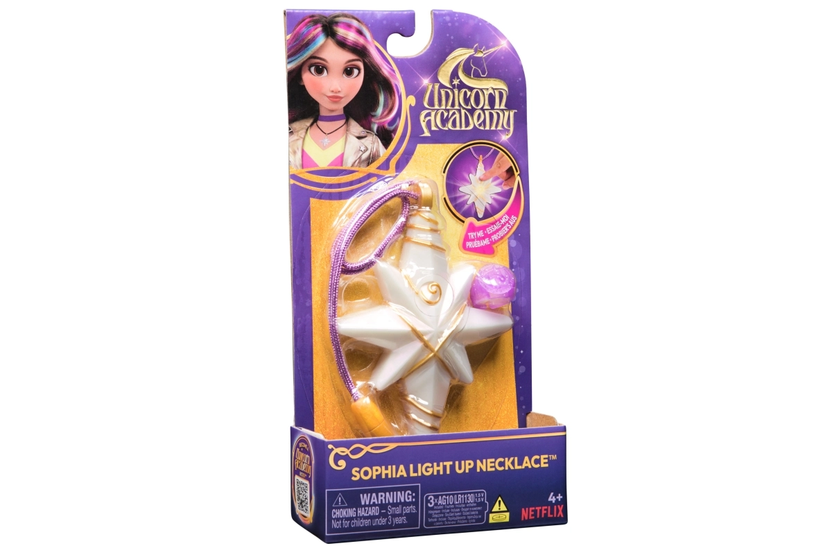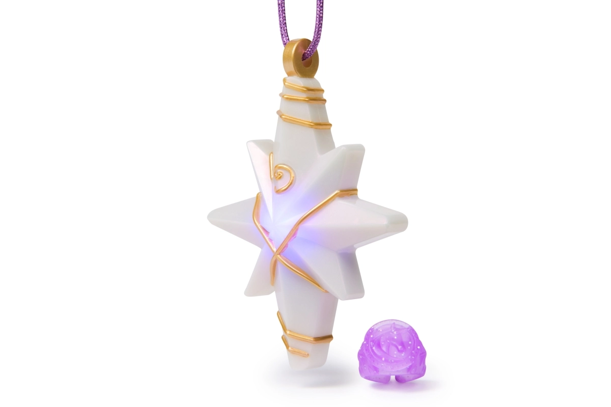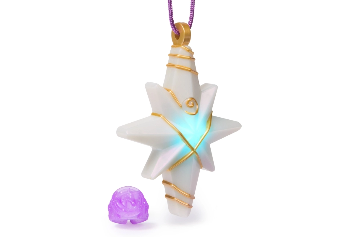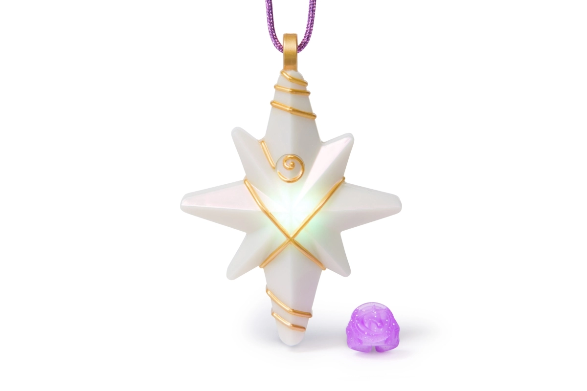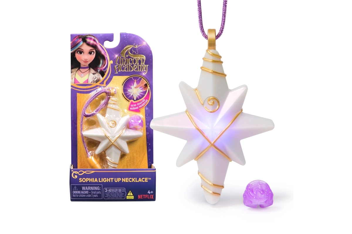 Der sternförmige Anhänger mit perlmuttfarbenem Körper und goldenen Details leuchtet nach Knopfdruck in mehreren Farben sowie in Weiß – genau wie bei Sophia in Unicorn Academy.