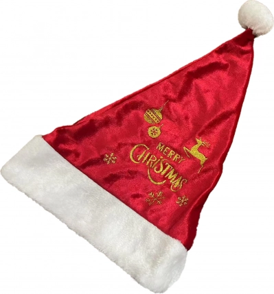 Diese elegante Weihnachtsmütze ist ein großartiges Accessoire für alle Weihnachtsanlässe. Ihr roter Grundton ist mit dekorativem goldenem Druck verschönert, der die Aufmerksamkeit auf sich zieht. Die weiße Bommel an der Spitze verleiht der Mütze einen traditionellen Look.