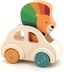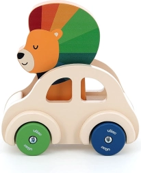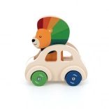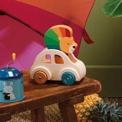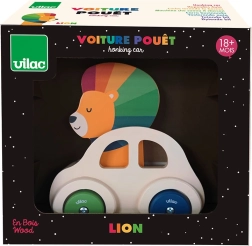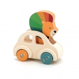 Dieses entzückende Holzauto ist das ideale Spielzeug für kleine Kinder. In der Mitte sitzt ein kleiner Löwe mit bunter Mähne und auf seinem Kopf ist eine Hupe angebracht, die bei Druck ertönt. Dies fördert die Interaktion und weckt zugleich das Interesse am Entdecken.