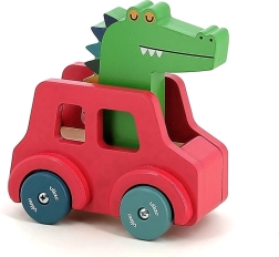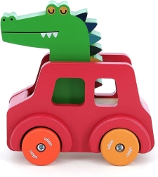 Das Holzauto in roter Farbe mit bunten Rädern verbirgt unter dem Krokodil eine kleine Hupe, die durch Drücken auf seinen Kopf aktiviert wird. Dieser einfache Mechanismus weckt die Neugier der Kleinkinder und bietet direkte Rückmeldung und Interaktion. Durch die ergonomische Form ist das Spielzeug ideal für kleine Kinder und hilft ihnen, ihre feine Motorik, Hand-Auge-Koordination zu entwickeln und fördert Kreativität und Vorstellungskraft.