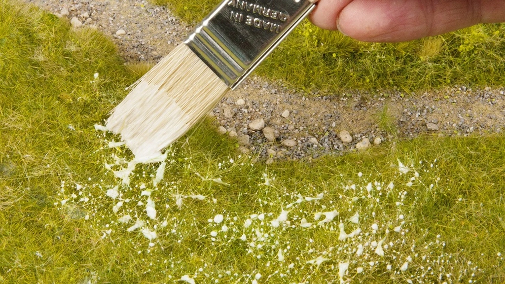 Der Kleber ist für die elektrostatische Begrünung geeignet und ideal für größere Flächen aufgrund seiner langsameren Trocknung. Nach dem Trocknen wird der Kleber transparent, wodurch das authentische Aussehen des Modellrasens erhalten bleibt.