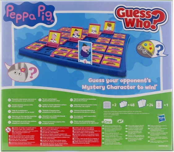 Genießen Sie Familienspaß mit dem Spiel Wer ist es? im Peppa Pig-Design. Stellen Sie clevere Fragen, erraten Sie die geheime Figur des Gegners und gewinnen Sie! Ideales Familienspiel für 2 Spieler ab 6 Jahren mit den beliebten Figuren aus der Serie Peppa Wutz.