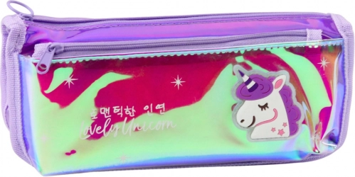 Stilvolles und praktisches lila Federmäppchen mit Einhorn, das ein ideales Accessoire für die Schulsachen der Kinder ist. Gefertigt aus holografischem Material, das im Licht seine Farbe ändert und mit seinem magischen Aussehen Aufmerksamkeit erregt.
