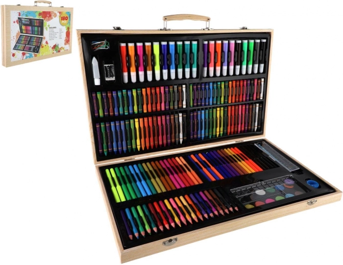 Entdecken Sie ein vielseitiges Kreativset zum Malen und Zeichnen mit 180 Teilen, übersichtlich verstaut in einem eleganten Holzkoffer mit Verschluss. Perfekt für kreatives Arbeiten zu Hause, Schulprojekte und als mobiles Kunstset für unterwegs.