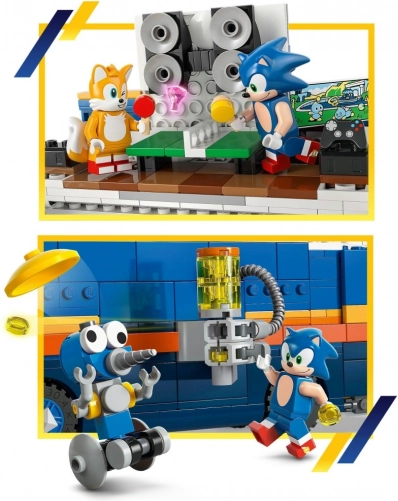 Entdecke die spezielle mobile Basis für SONIC und sein Team. Der große blaue Lkw lässt sich seitlich öffnen; innen gibt es eine Werkstatt und eine Relax-Zone mit Szenen für kreatives Spiel. Die abnehmbare Kabine bietet Platz für zwei Minifiguren, und im hinteren Bereich verbirgt sich eine Rampe mit Shooter für den schnellen Start von TAILS auf dem Quad.