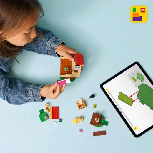Baue Goldies farbenfrohes Häuschen mit rotem Dach, Briefkasten und gemütlichem Innenraum mit Bett und Klavier. Draußen warten ein Picknicktisch mit Croissant, Birne und Becher – perfekt für fantasievolle Geschichten. Dank der LEGO Builder App können Kinder Modelle in 3D vergrößern und drehen und so noch sicherer bauen.