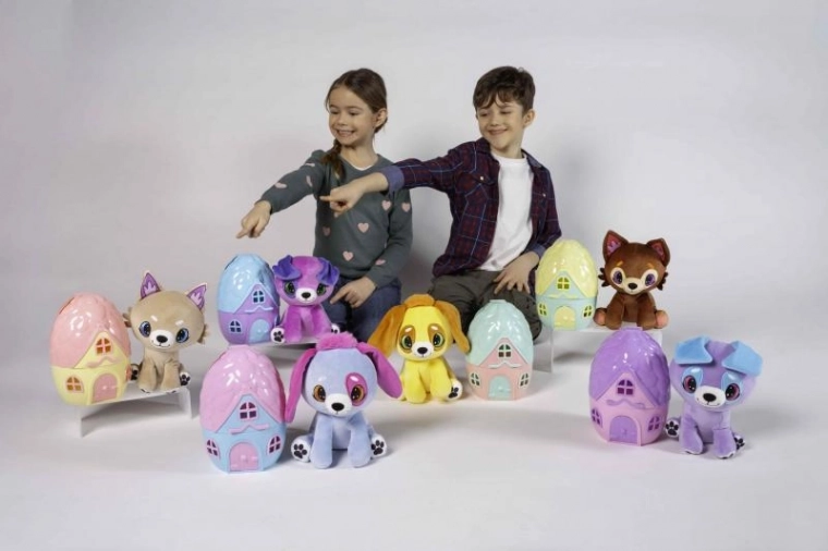 Die Kollektion enthält niedliche Plüschtiere in Farben wie Violett, Braun, Blau, Gelb und Rosa. Jedes Spielzeug wird mit einem Häuschen für einfache Aufbewahrung geliefert.
