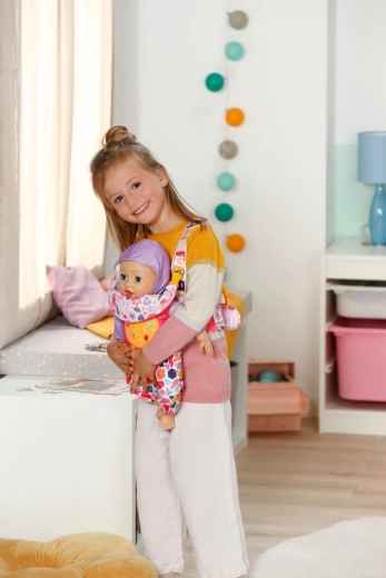 Der leichte und robuste Tragegurt hält die Puppe sicher auf der Brust, sodass Kinder überall mit freien Händen spielen und helfen können.