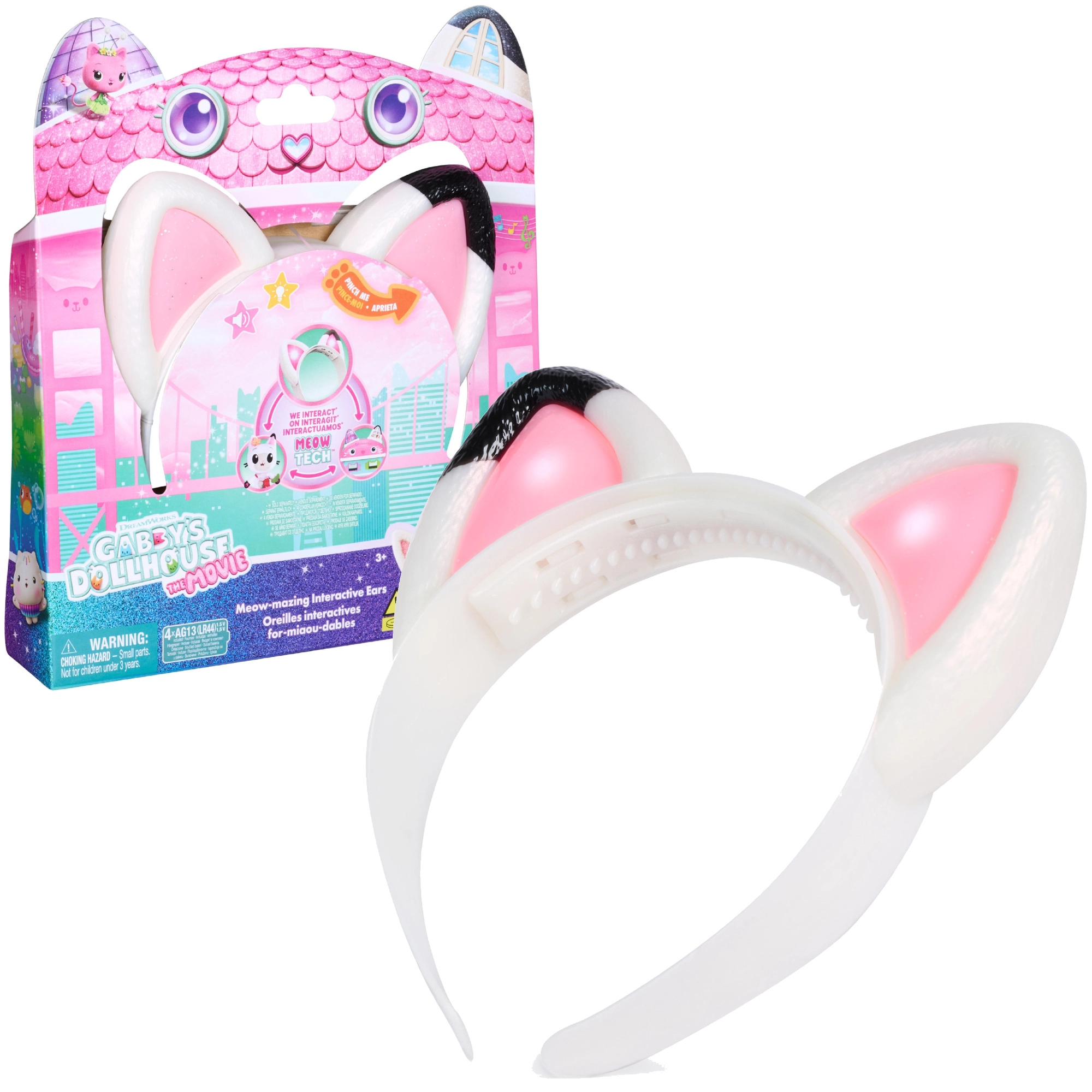 Tauche ein in die Welt der Serie Gabby’s Dollhouse mit dem magischen Katzen- Haarreif mit Öhrchen. Das weiße Design mit rosa Innenseiten und einem niedlichen schwarzen Punkt auf einem Ohr begeistert jeden kleinen Fan. Beim Drücken eines Ohrs ertönen Gabbys Lachen, Miauen und eine fröhliche Melodie. Ideal für Verkleidungen, Rollenspiele und als Kostüm-Accessoire.