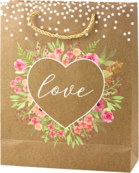 Diese Geschenktasche besticht durch das feine Zusammenspiel von schönen, bunten Blumen und der Aufschrift "Love". Kleine Brokatpunkte oben auf der Tasche verleihen ihr Sanftheit und Leichtigkeit.
