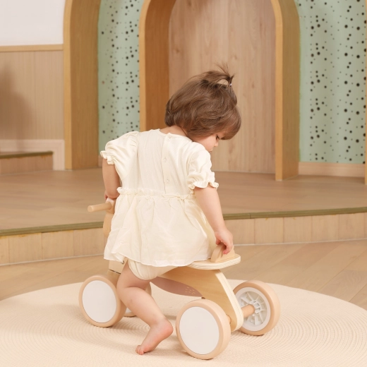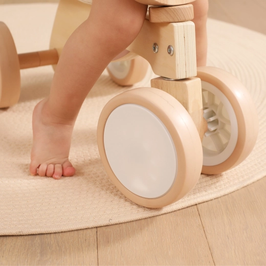 Die ersten Schritte in die Welt des Fahrens gelingen dank der stabilen Vierrad-Konstruktion und dem bequemen Sattel mit Rutschschutz-Rückenstütze ganz sicher. Das Lauflernrad besteht aus hochwertigem Holz und verfügt über leise EVA-Räder, die bodenschonend sind und auch glatte Außenflächen meistern.