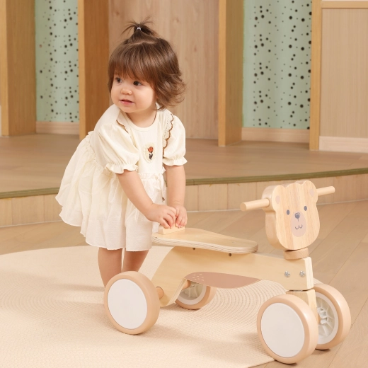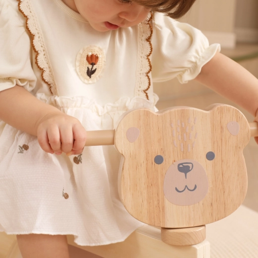 Für zusätzliche Sicherheit sorgt die Lenkbegrenzung, die ein übermäßiges Einschlagen des Lenkers verhindert. Beim Spielen entwickeln Kinder ganz natürlich ihre Balance, Koordinationsfähigkeiten und Grobmotorik. Die niedliche Bärenfront und das natürliche Design passen hervorragend ins Kinderzimmer.