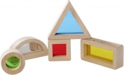Bausteine in verschiedenen Formen laden zum Experimentieren mit Licht, Farben und Formen ein. Kinder können die Welt durch farbige Linsen betrachten, Farben mischen oder sich im Spiegeleffekt betrachten. Die sorgfältige Verarbeitung aus robustem Buchenholz sorgt für eine angenehme Haptik und lange Lebensdauer.