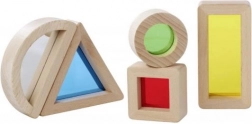 Das Set enthält vier Grundformen – Dreieck, Rechteck, Quadrat und Kreis – ergänzt durch ein Teil mit Spiegelfolie. Dank der kompakten Abmessungen liegen die Bausteine auch den Kleinsten gut in der Hand und eignen sich ideal für freies Spiel, Sortieren und Bauen.